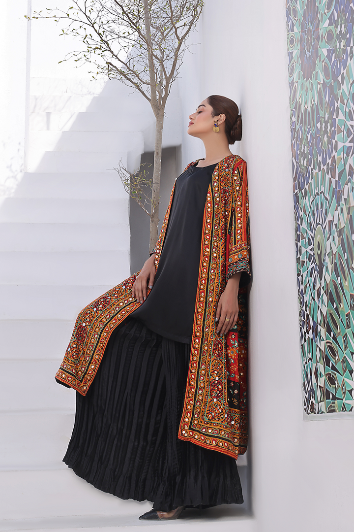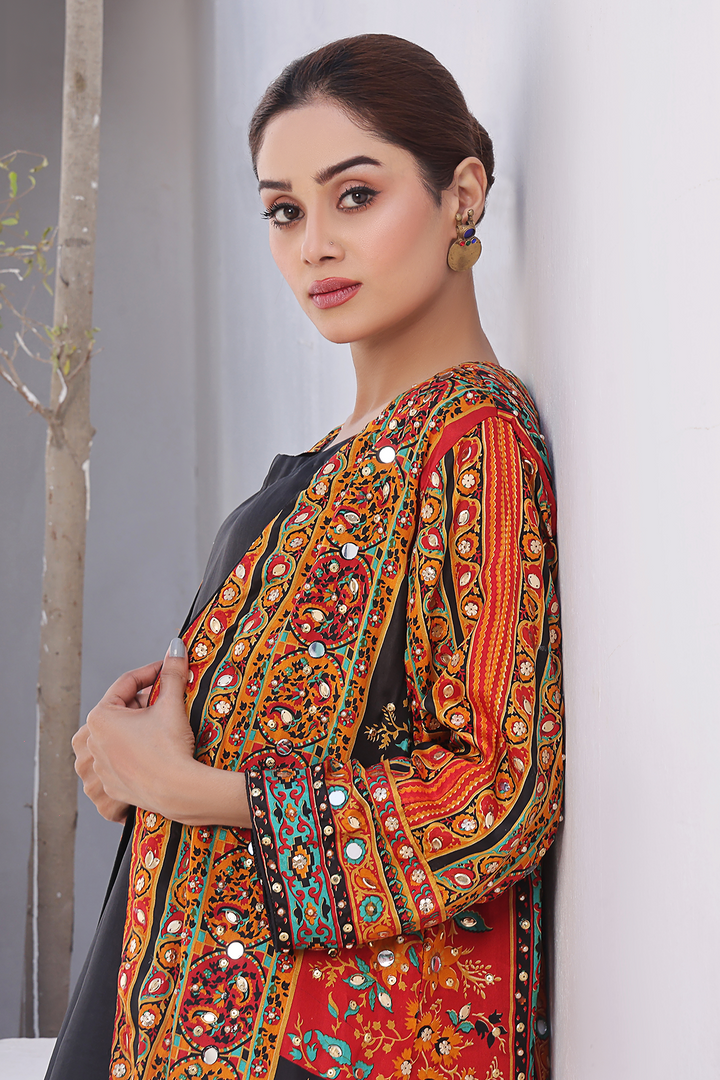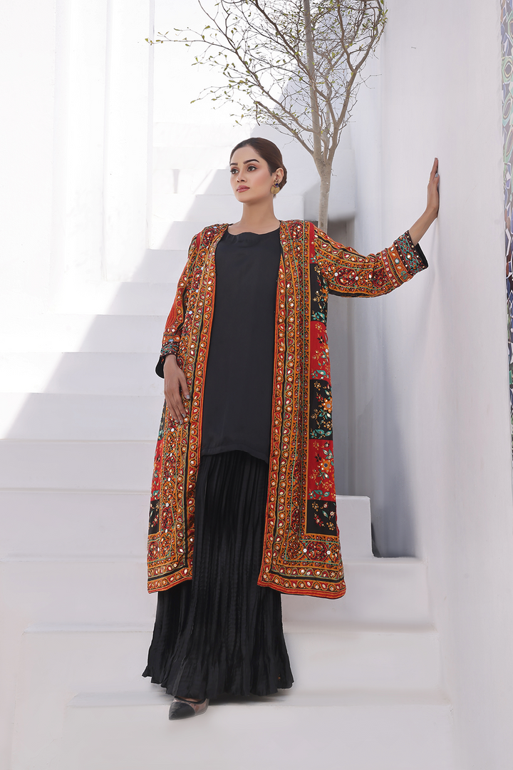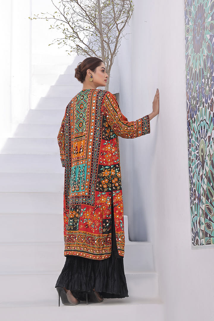 A medium silk printed long jacket adds a layer of sophistication, adorned with intricate mirror work that catches the light with every movement. The shamos finishing adds a traditional touch, enhancing the jacket's allure with its delicate detailing.