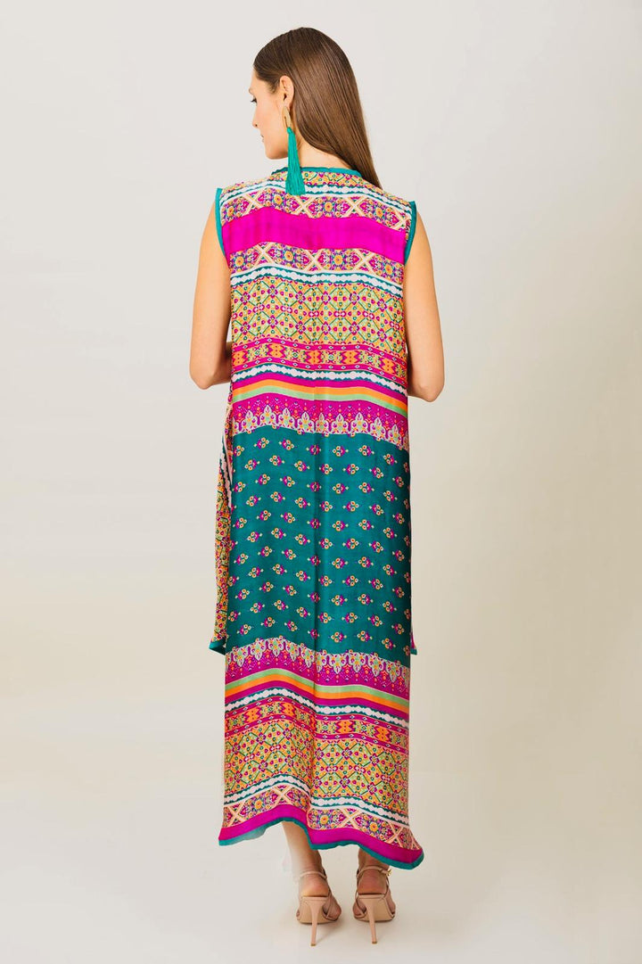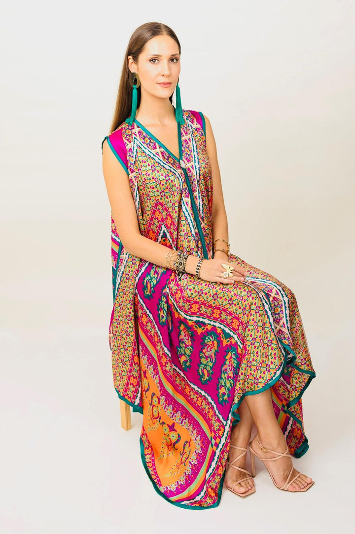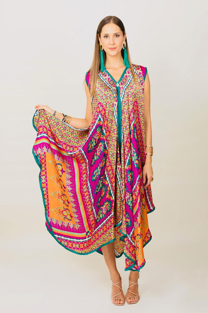 The Irmina kaftan redefines nomadism with punk poetics, where sands meet mohawks. Tribal patterns converse with rebellious graffiti, encapsulating a borderless dialogue between ancient roots and anarchic creativity.