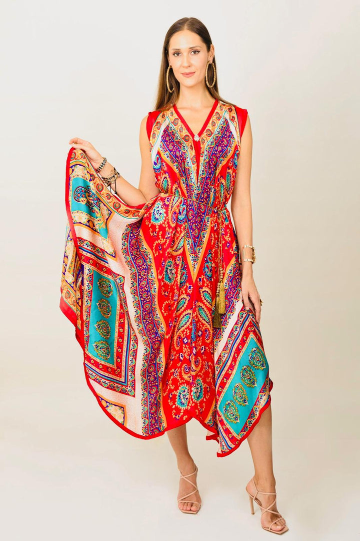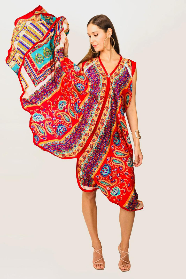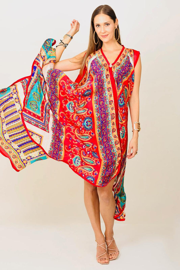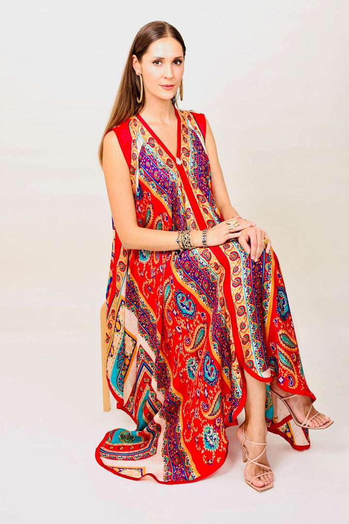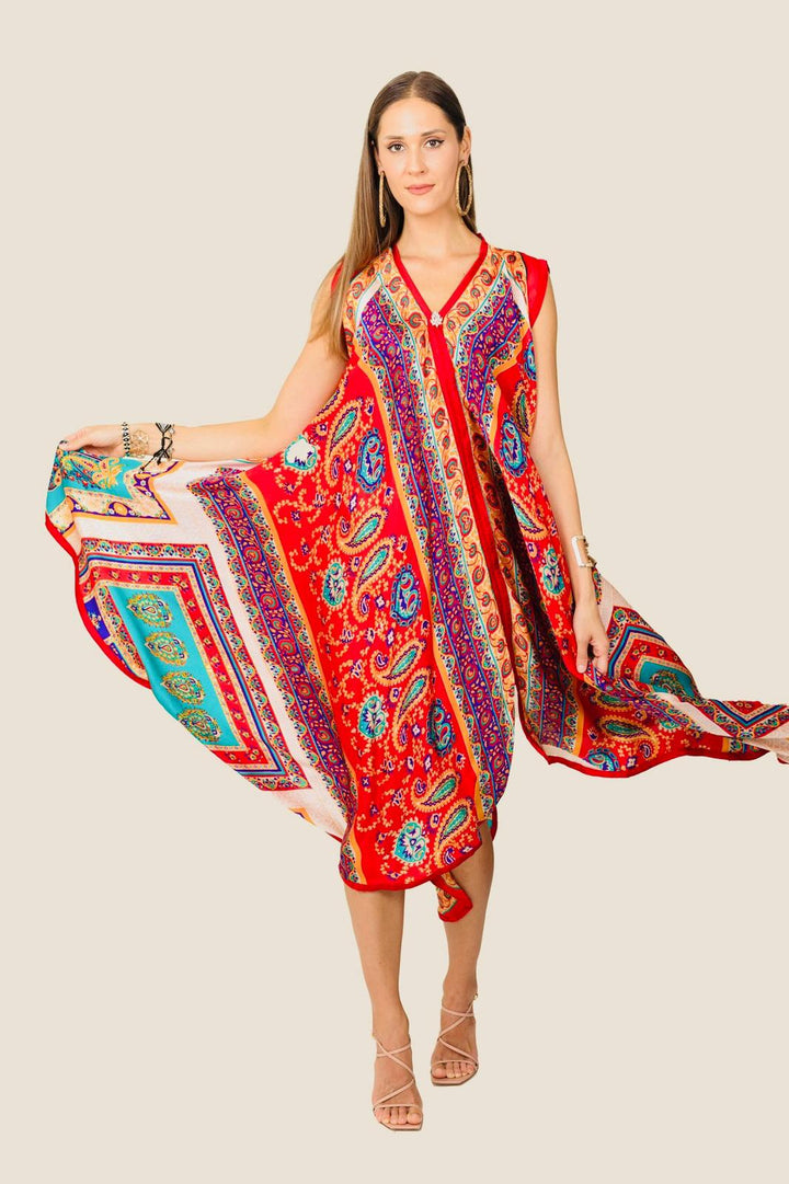 The Isolde Kaftan tells the tales of desert wanderers through threads that pulse with funky fervour. Tribal echoes harmonize with pop flourishes, a rhythmic narrative where nomadic heritage grooves to the beat of modern eclecticism.