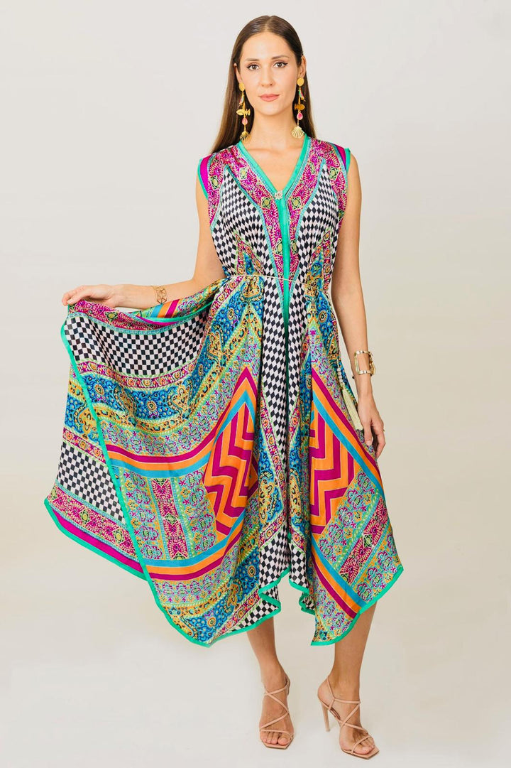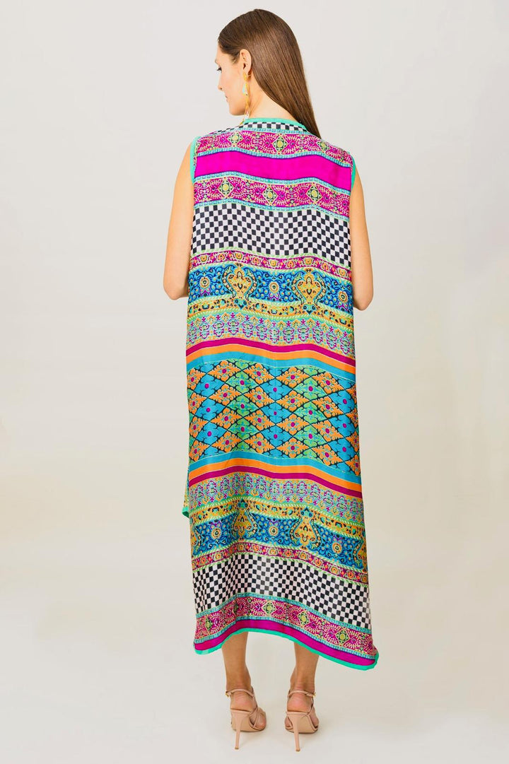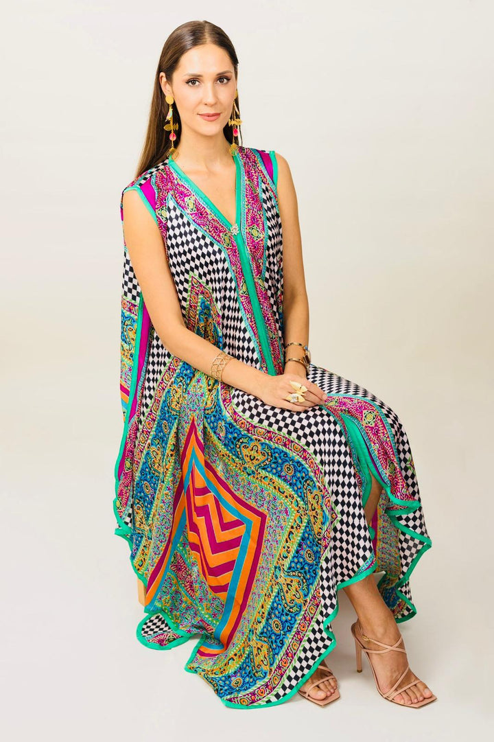 Sprinkle the element of chic and ultra-modern with a hint of folklore into your closet with this captivating Kaftan. The exquisite addition of monochrome chess prints to rhomboid rainbow hues on fine silk of this outfit reminisces a fanciful taste.