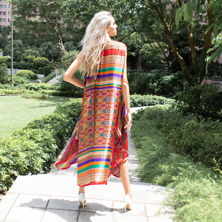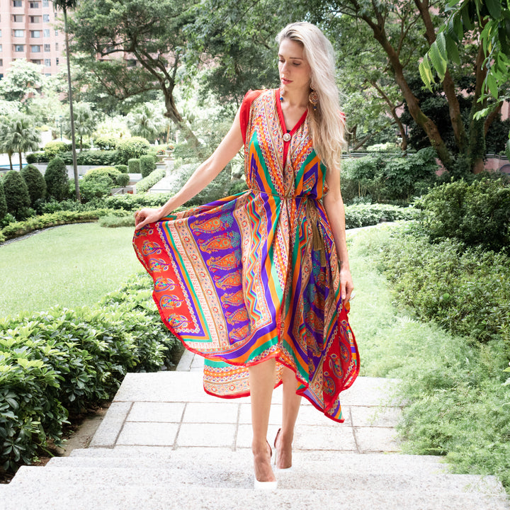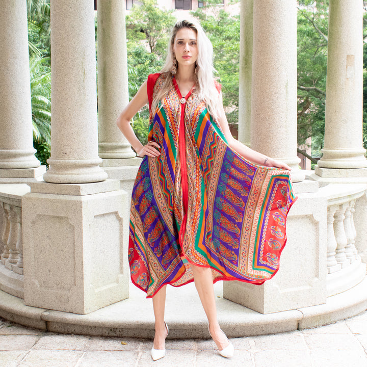 Handcrafted Silk Kaftan Screen Printed in Exotic Paisley Motives and Chevrons. The Exotic Kaftan has an asymmetrical silhouette. Pure Silk Lusciously Adorning All Body Sizes.Complimentary Dazzling String Belt Makes This Unique Outfit Quite Versatile.Red is Amalgamating With Pristine Purple. Hand Drawn Curated Print At the Back Adding A lot As A Fashion Statement.