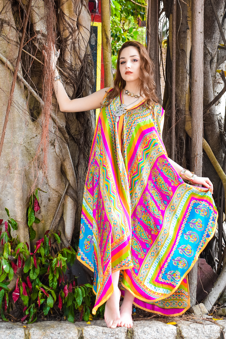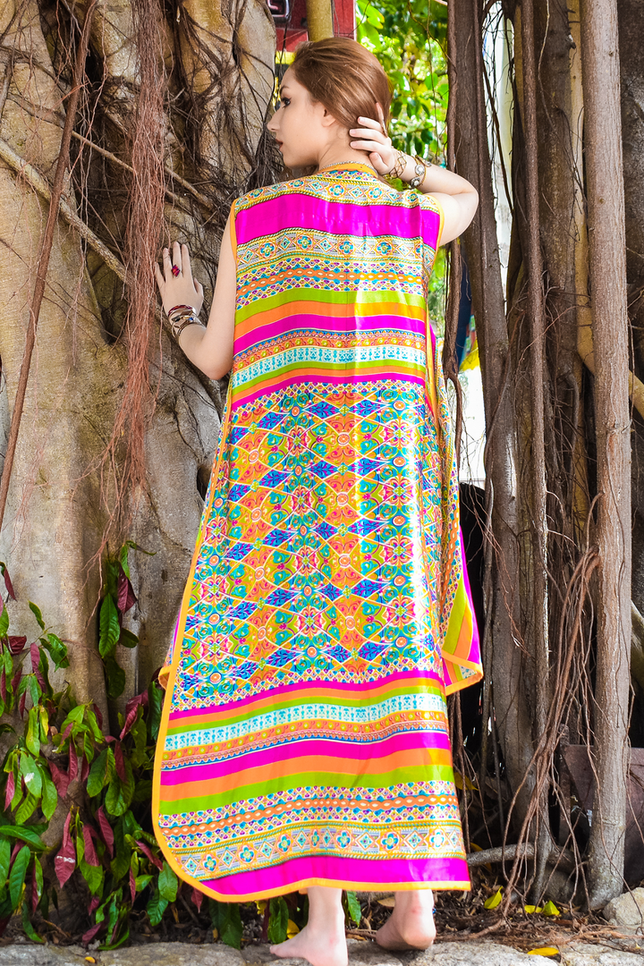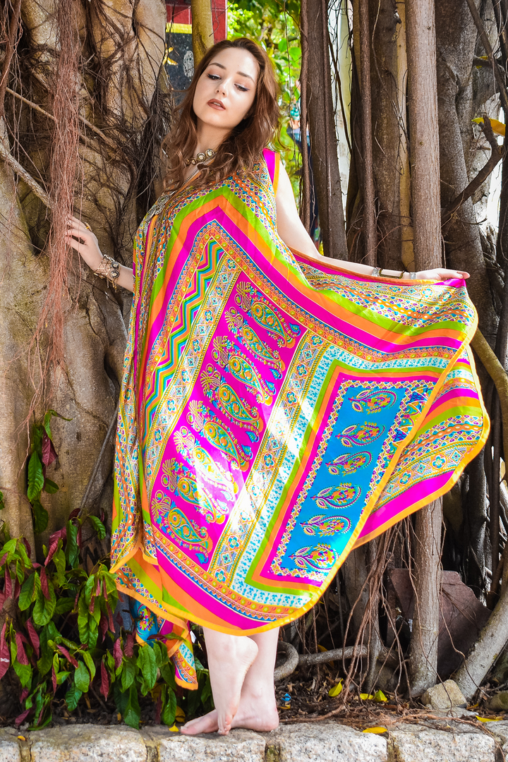 This ravishing Kaftan delivers a Hawaiian beachy vibe with its vibrant colors. The floral twines and mini-colored blocked patterns on the luxurious silk of this outfit are hooked to catch any eye and gather spotless appreciation.