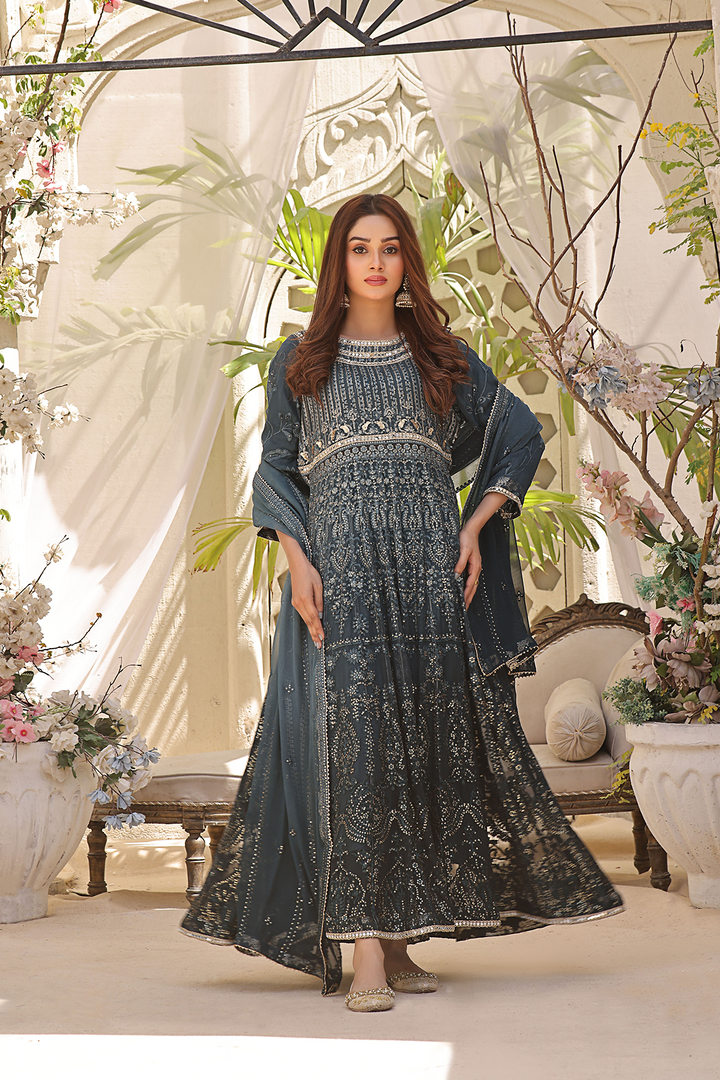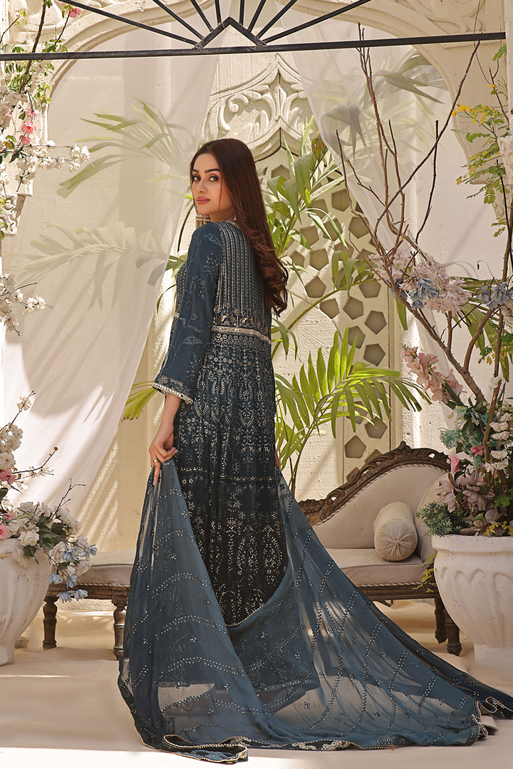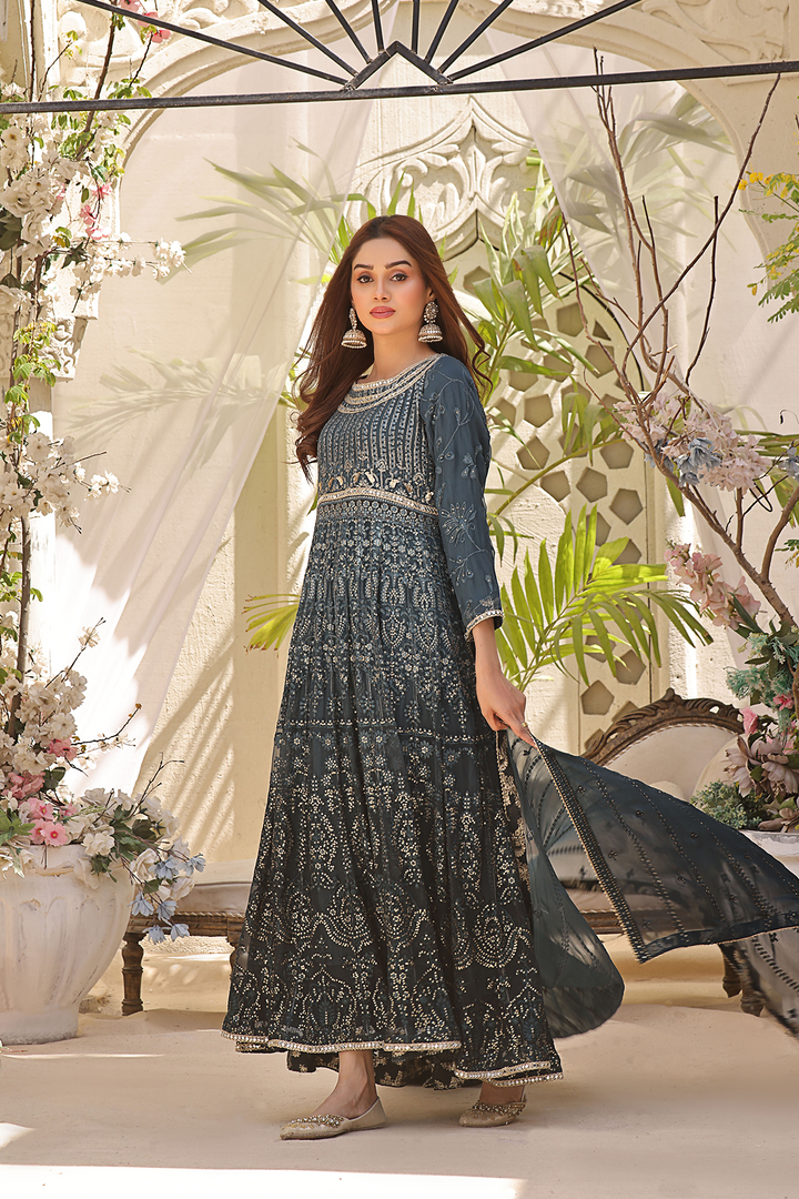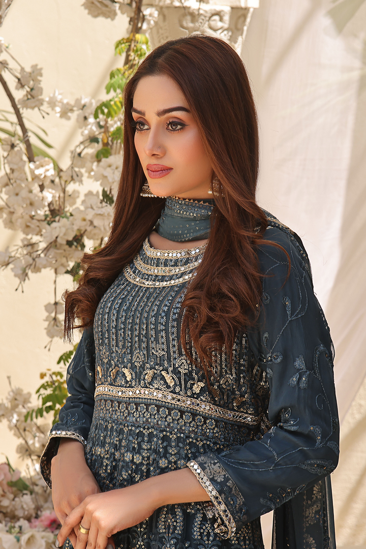 This majestic ensemble features a pure chiffon shirt adorned with exquisite embroidery, reminiscent of lush foliage in a royal garden. The rich bottle green exudes opulence and grandeur, making a bold statement.