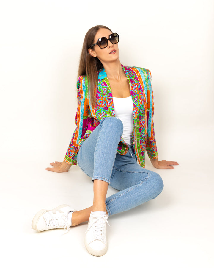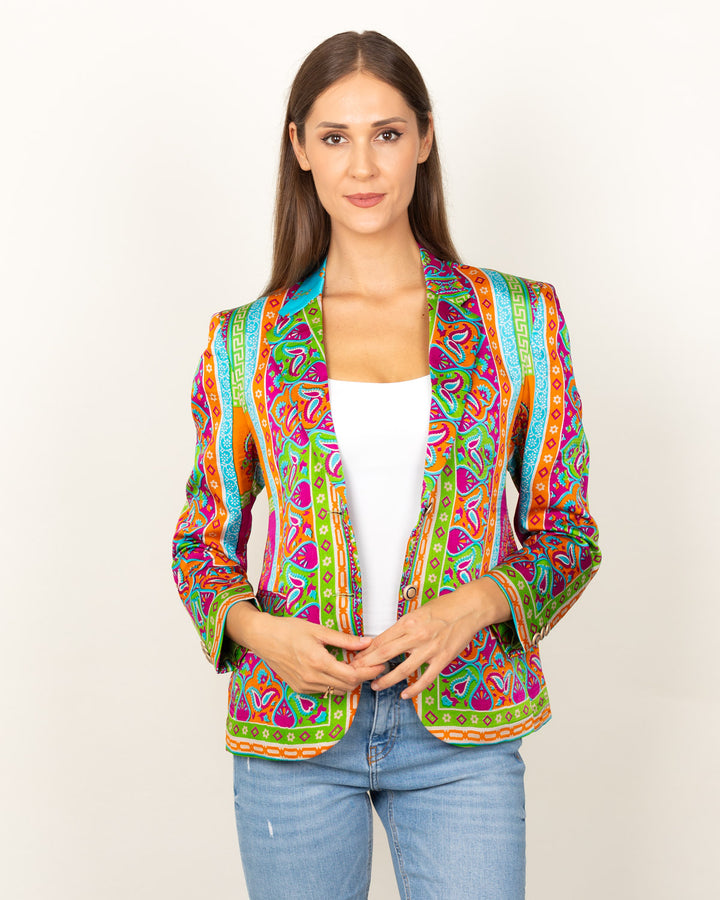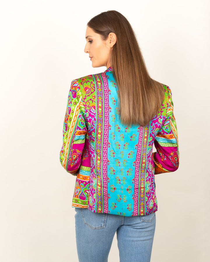 Luisa Blazer embarks on a whimsical odyssey woven with bold proclamations. Mythical realms intertwine with rebellious patterns in contrasting hues, inviting wearers to traverse a realm where fantasy meets modernity.