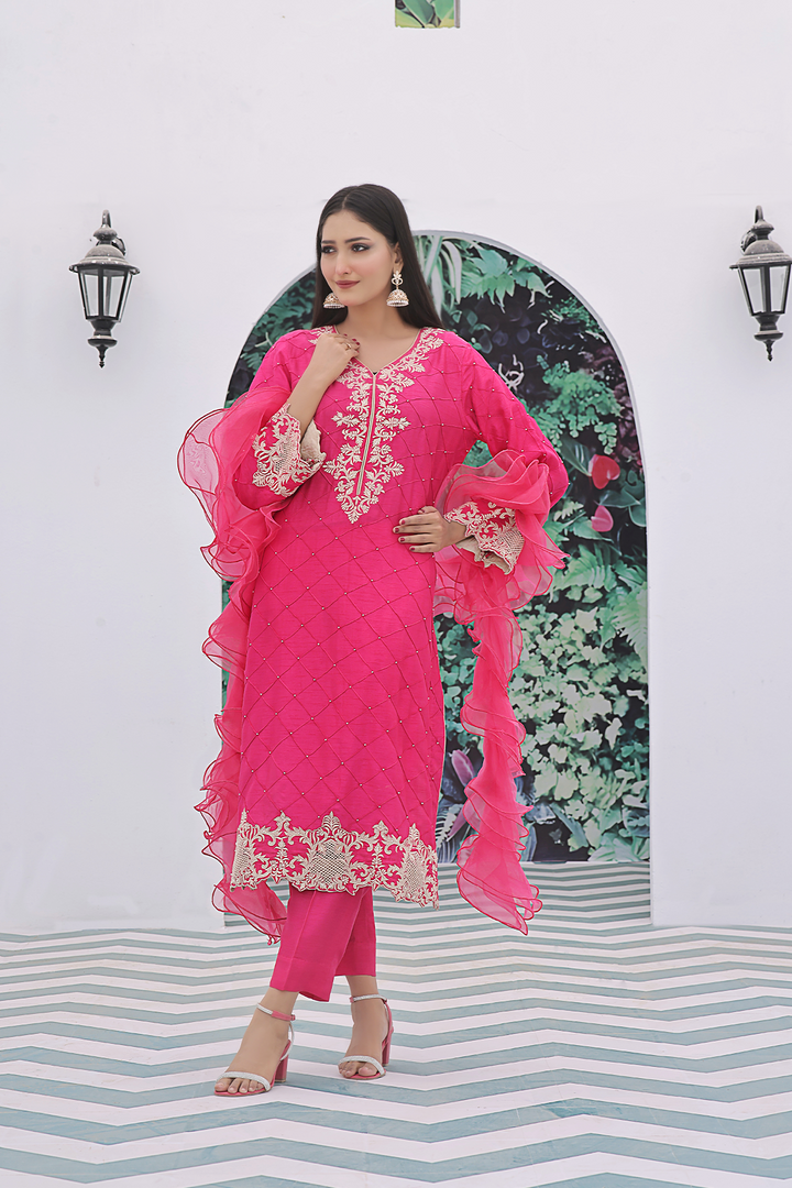 Radiating vibrancy and energy, this three-piece Eastern ensemble shines in a captivating bright pink color in a crisscross pleated fabric with pearls at cross intersections. The intricate embroidery embellishing the neckline, sleeves, and front shirt bottom adds an exquisite touch of detail and craftsmanship. Paired with cotton silk trousers for a seamless blend of tradition and modernity, and accompanied by a net frill dupatta, this ensemble is a delightful choice for festive celebrations.
