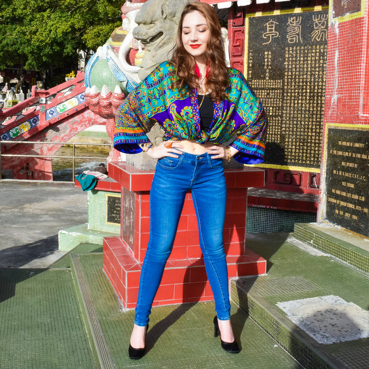The dynamic duo of emerald and sapphire create this gleaming effect in viscous eye-catching patterns presenting an astounding attire. This sleek Kimono is bound to bless your persona with an urbane sophisticated touch and elegance.