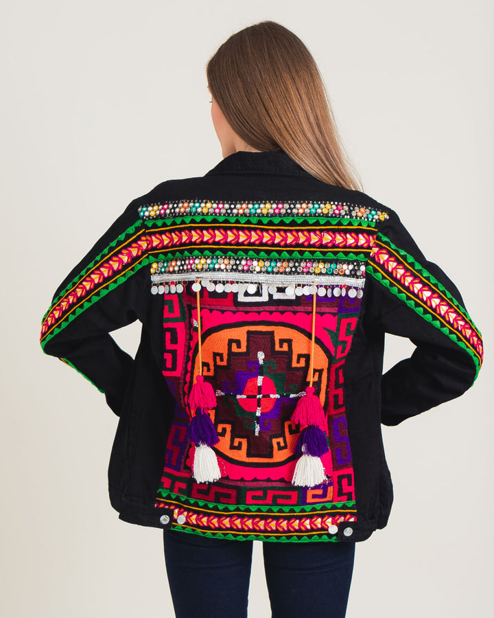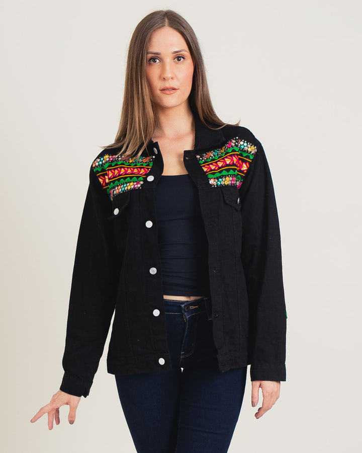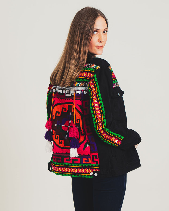 This denim jacket is an exquisite blend of Western denim and traditional ethnic embroidery. The bright, bold colours and intricate designs make it a true work of art, while the comfortable, colloquial fit makes it perfect for pairing with any outfit. With its unique combination of traditional and modern styles, it is an ideal complement to your closet.