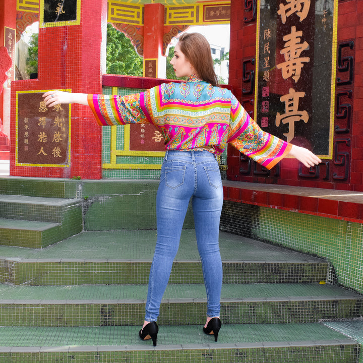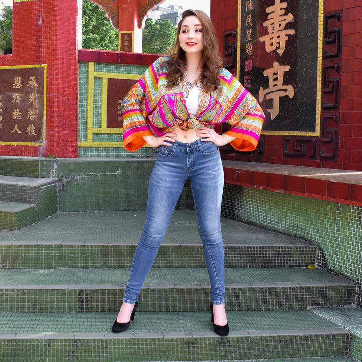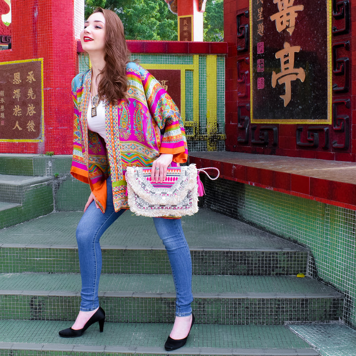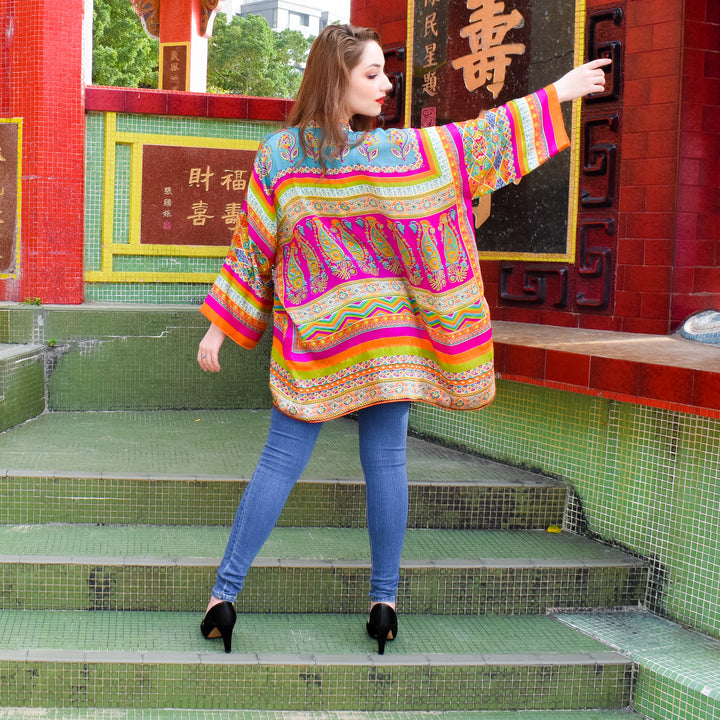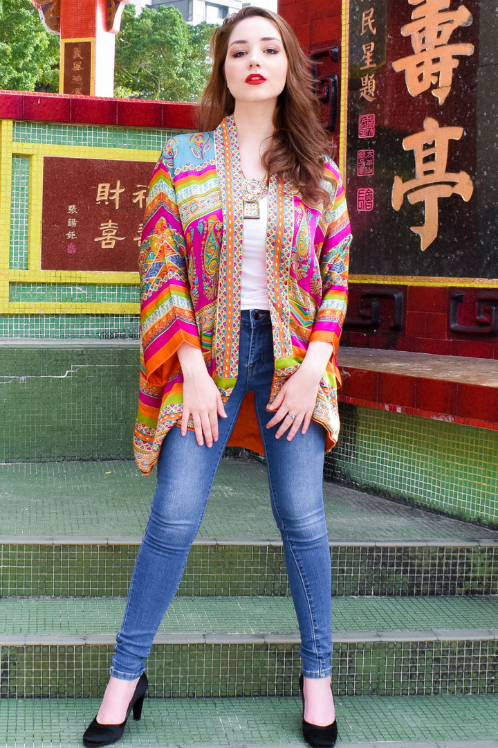 The bleethe and gleeful tones in bohemian symmetric patterns, phenomenal paisley details, and fancy floral imprints manifest magnificence. This strikingly noteworthy kimono will add a spark to your personality that will ultimately let you be the light of every room.