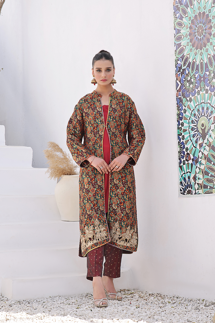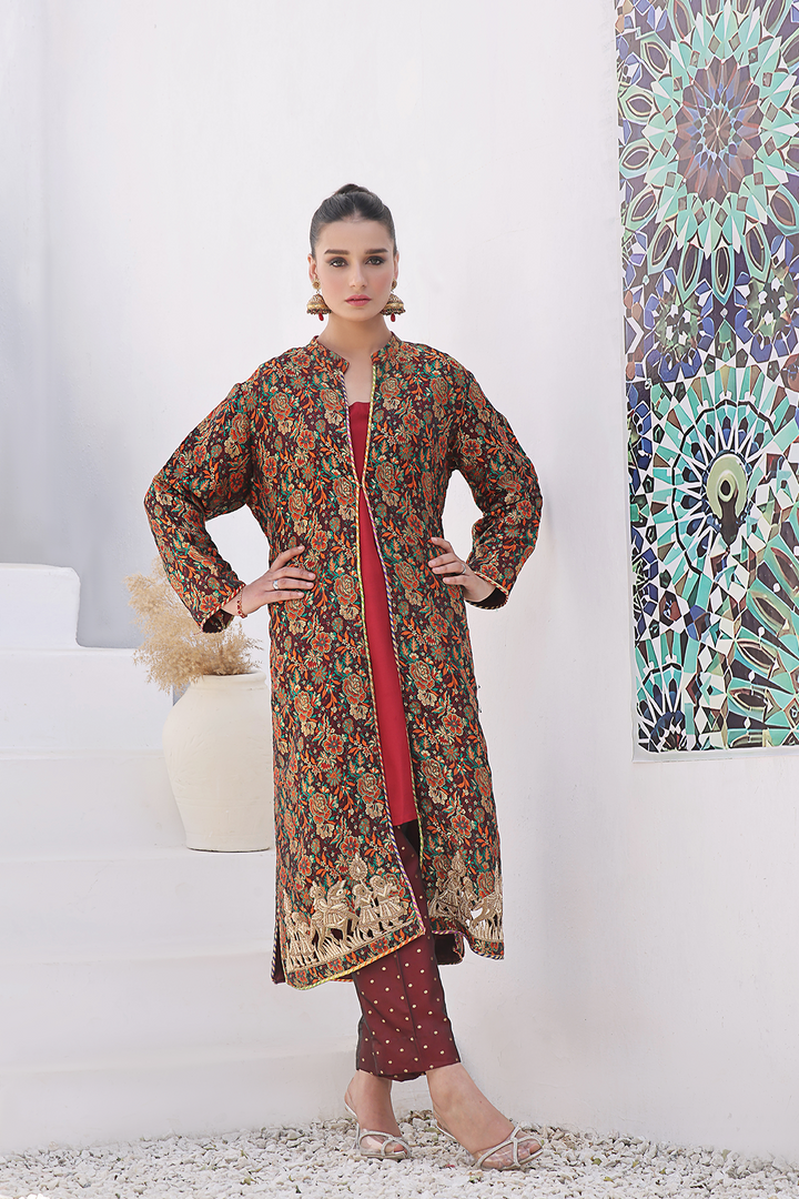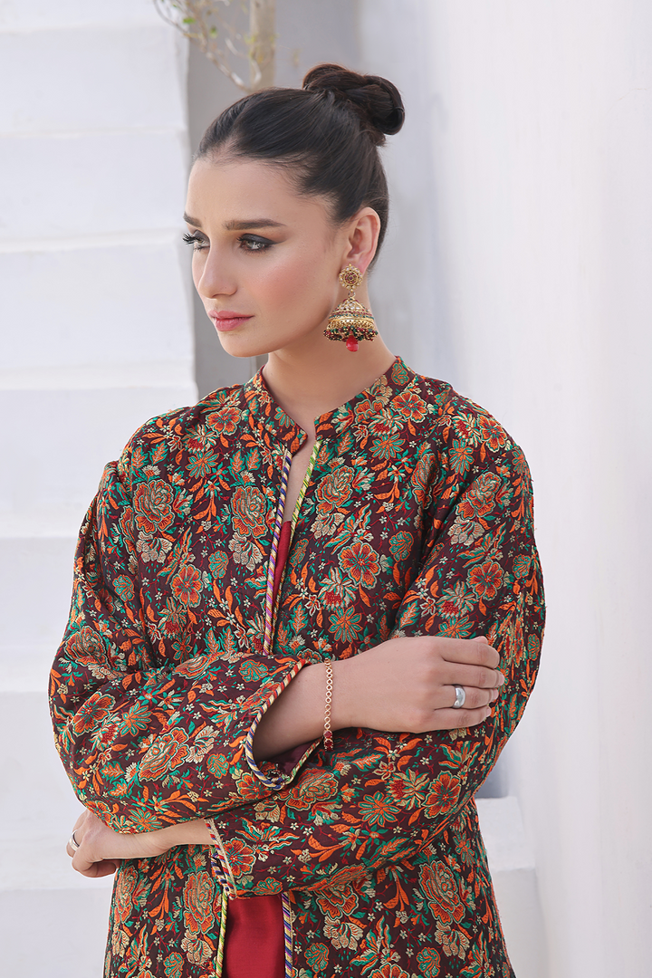 Make a statement at festive occasions with this sophisticated 3-piece Sherwani ensemble showcasing a fusion of traditional and contemporary design elements. The ensemble consists of a tailored trouser, an elegant inner, and a long-length fusion Pure Handwoven Kamkhwaab Sherwani with dori piping finishing at hem and openings.