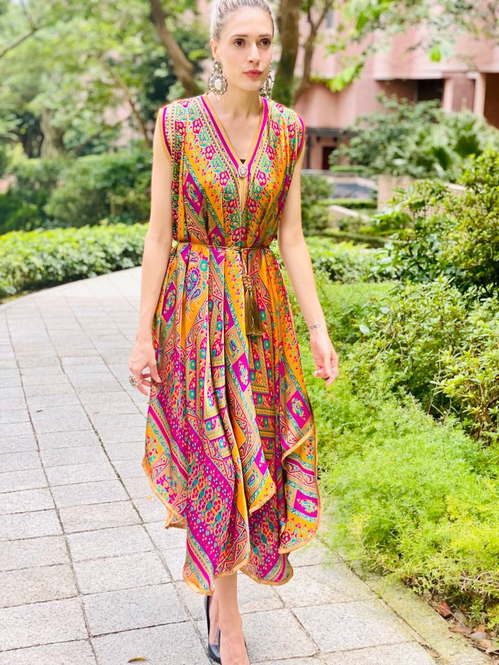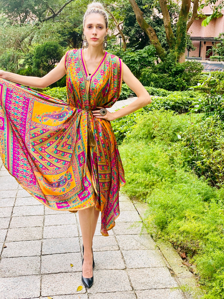 The outstanding Oaklynn kaftan illustrates a luxurious color palette of punchy pink and tangerine in fusion with the lustrous material of premium silk to deliver class with a twist of funkiness.