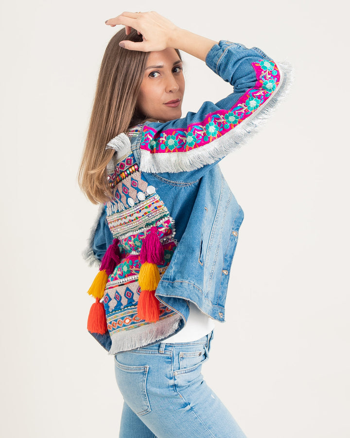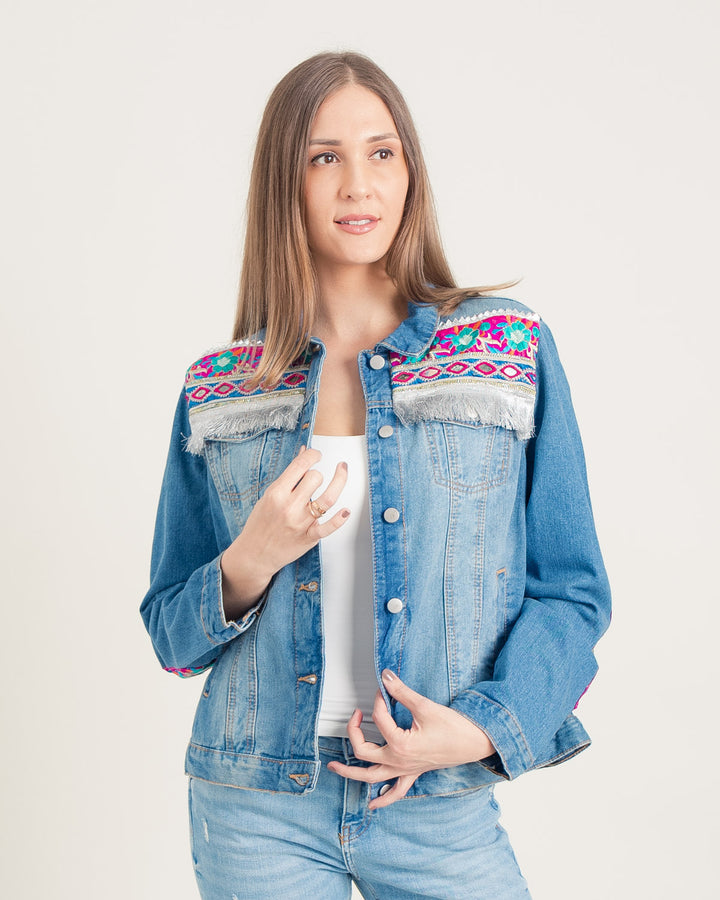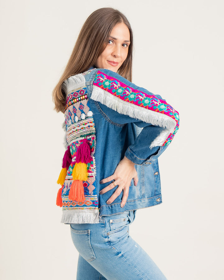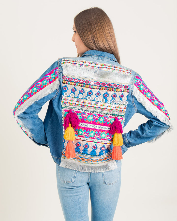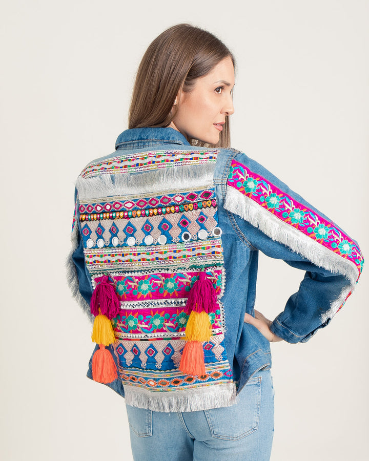 Through its intricate embroidery and unique blend of cultural motifs, this fusion denim jacket embodies the very essence of cross-cultural fusion, a harmonious union of diverse traditions and styles. The bright colours and intricate embroidery make it a true work of art, while the Western denim styling adds a modern touch.