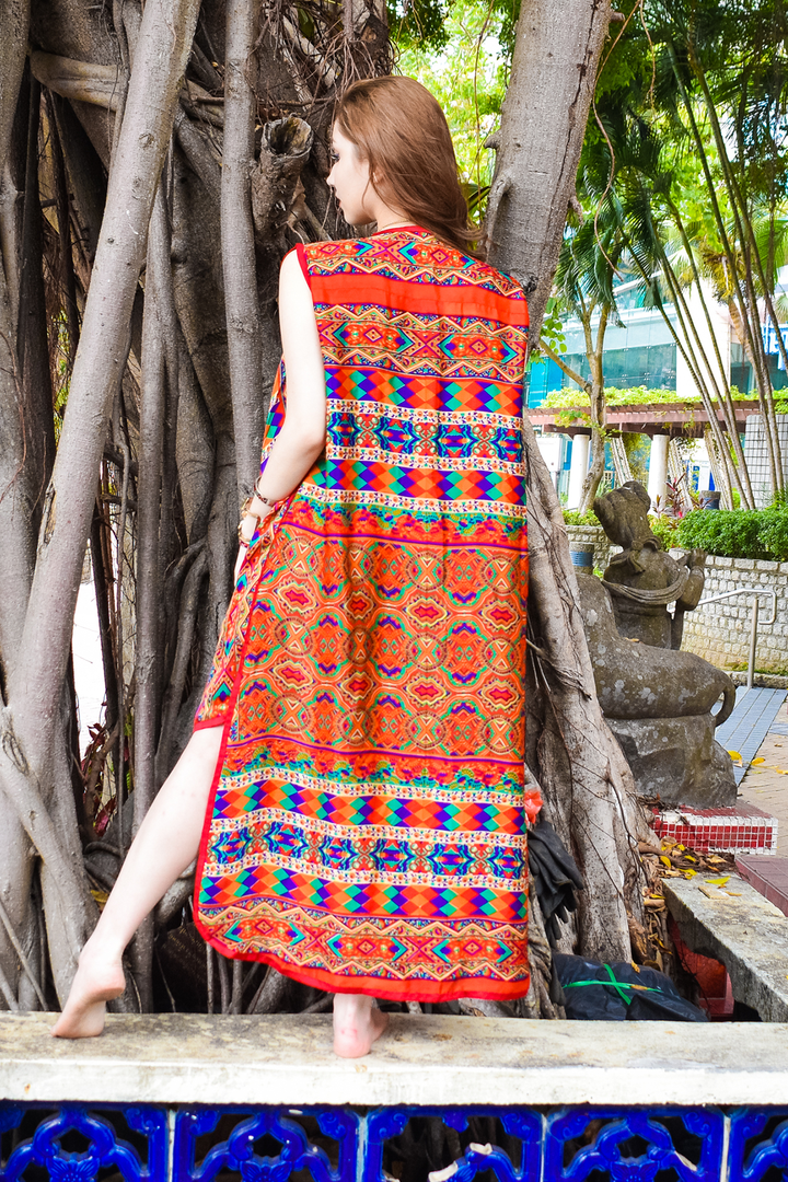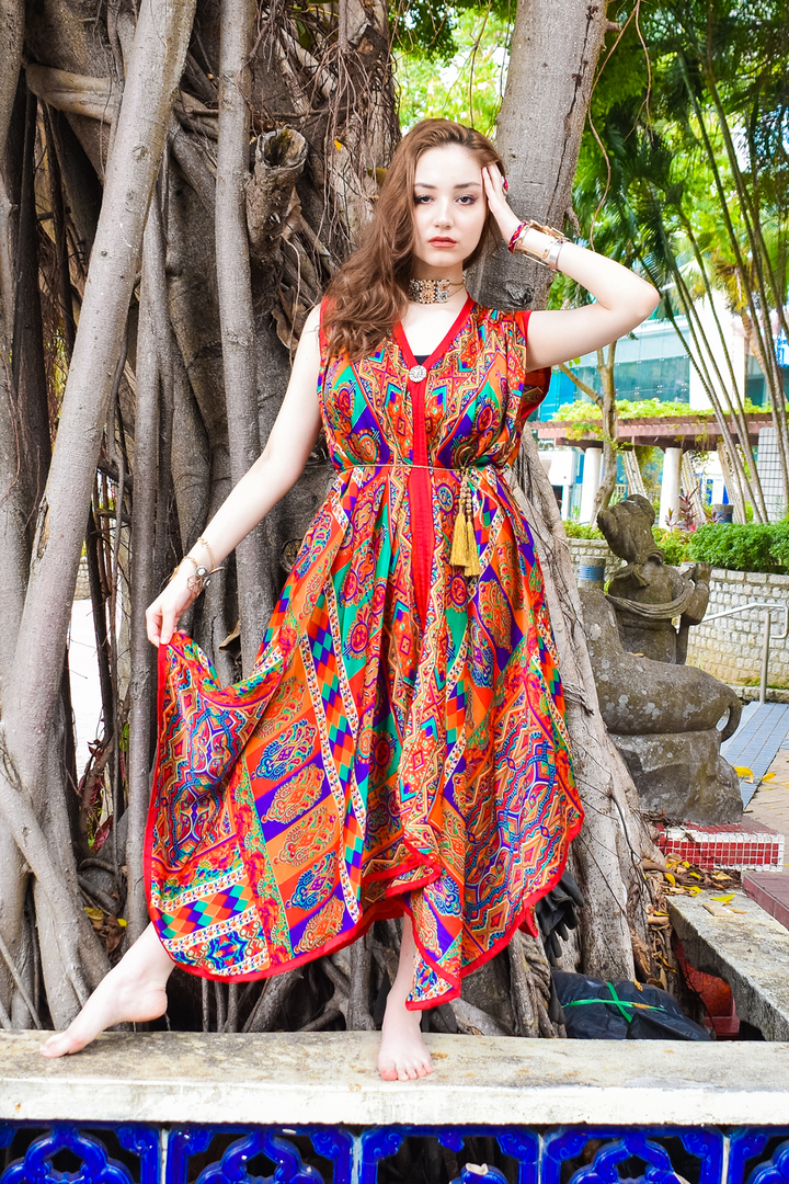 Now offering lush and luxury, all in one. This kaftan reflects an immaculate fusion of flair and fantasies in a mingle of rainbow hues. The finishing of orange around its borders further offers a funky experience.