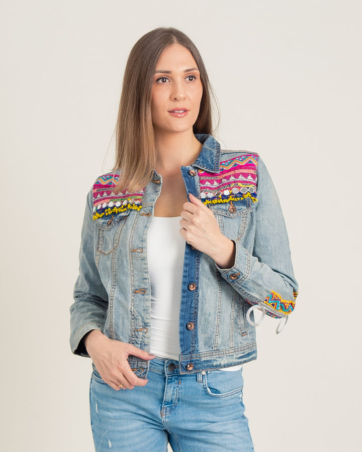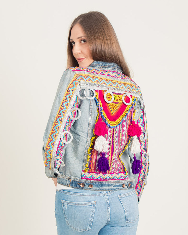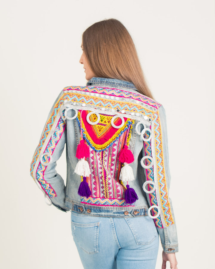 This Phoenix fusion denim jacket seamlessly blends the rich and intricate textures of Oriental and ethnic design elements, creating a mesmerizing tapestry of cultural artistry. The result is a staggering, eye-catching piece that will make you stand out.