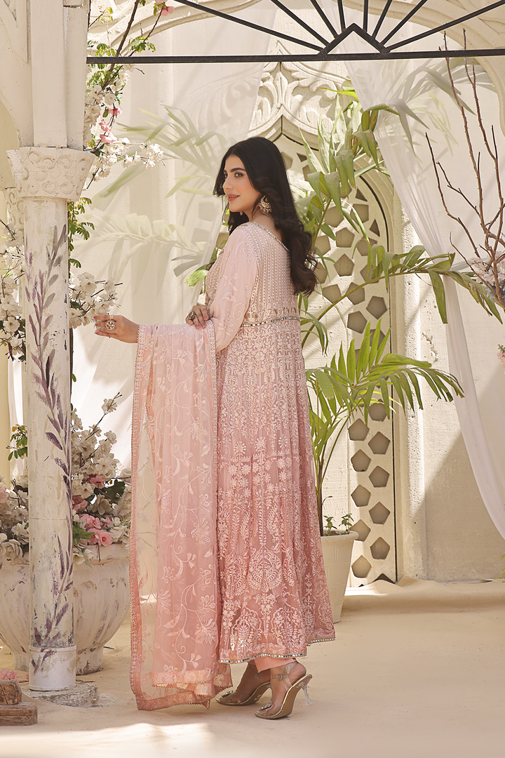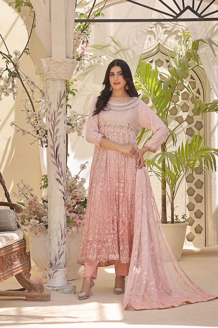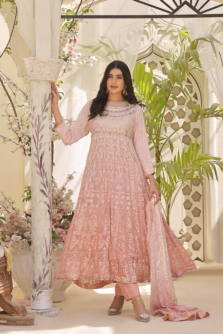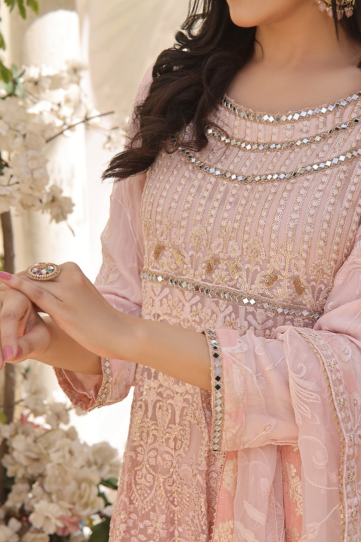 Embrace enchantment with this pink-hued attire, featuring a pure chiffon shirt adorned with intricate embroidery, reminiscent of fairy-tale motifs. The pink hue exudes mystery and allure, perfect for evening affairs. Paired with cotton silk trousers, offering comfort and style for effortless elegance.