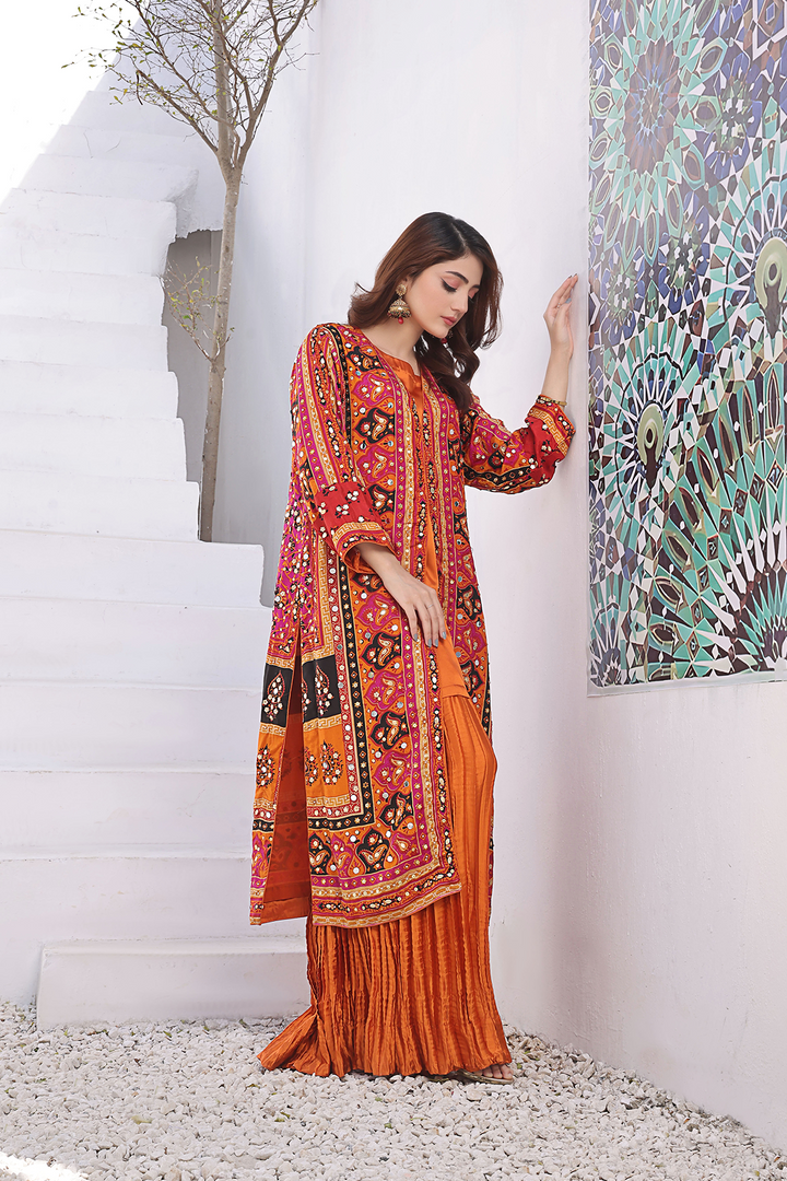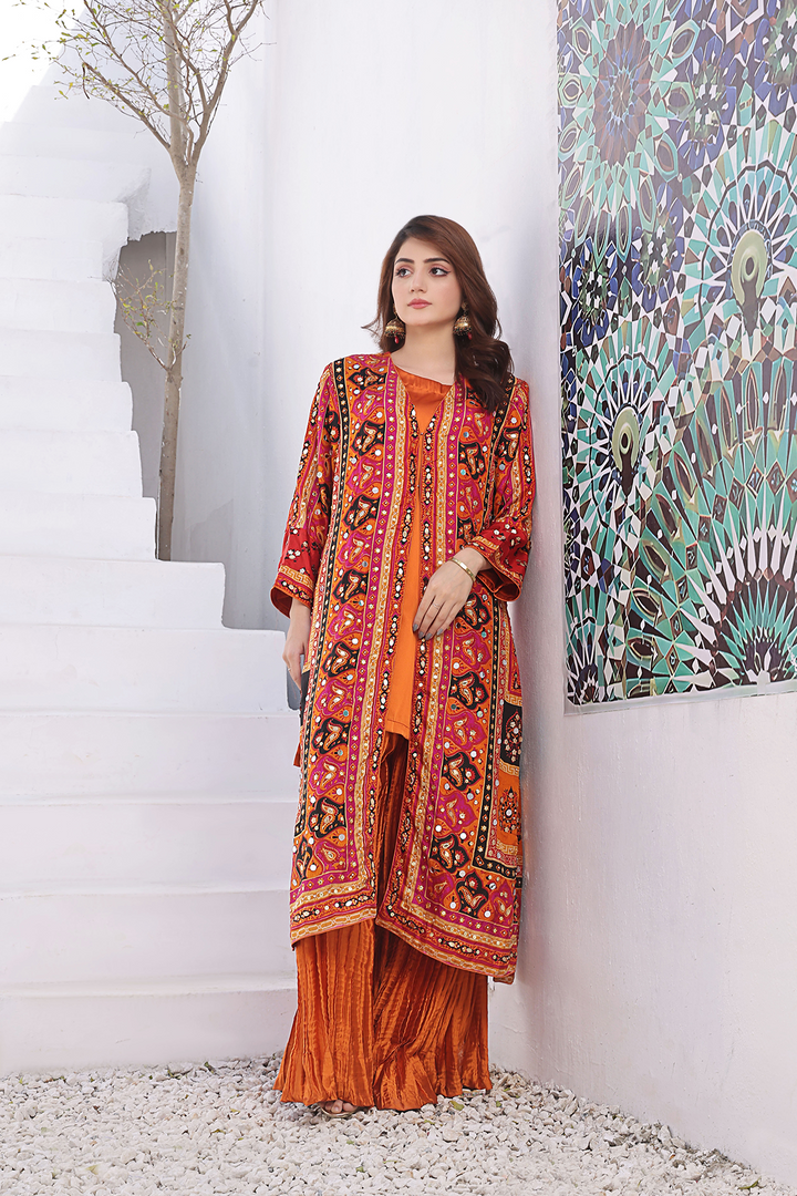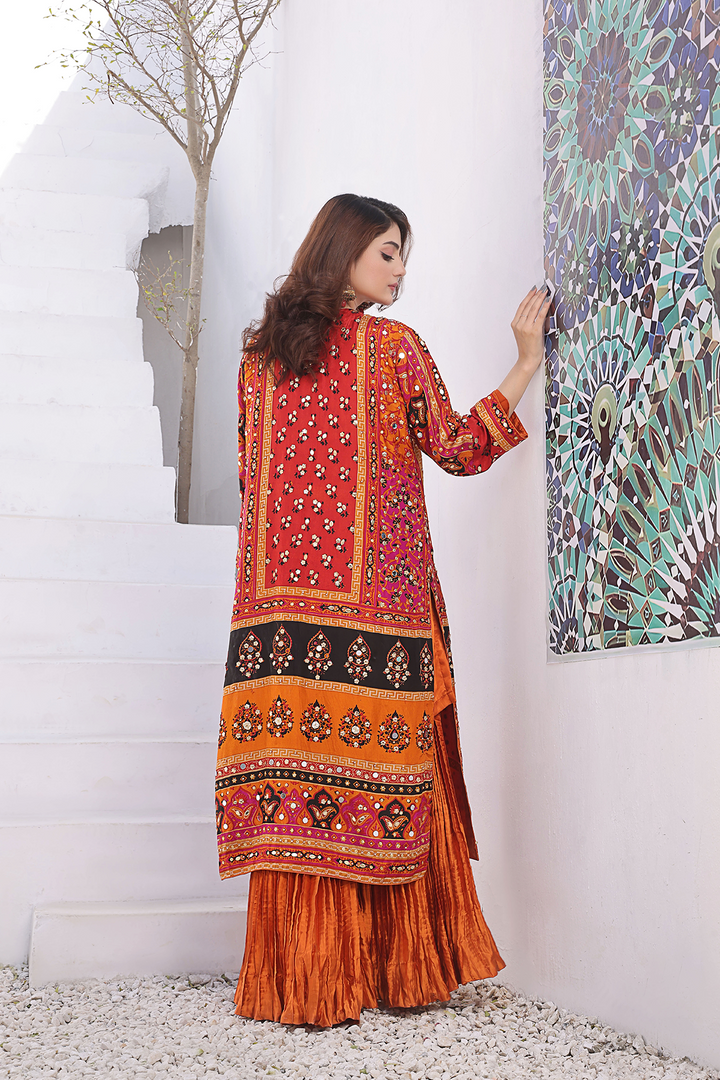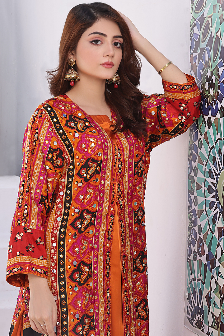 Adorning the ensemble is a medium silk printed long jacket, adorned with intricate mirror work, adding a touch of regal charm. The shamos finishing adds a traditional flair, enhancing the jacket's allure with its delicate detailing.