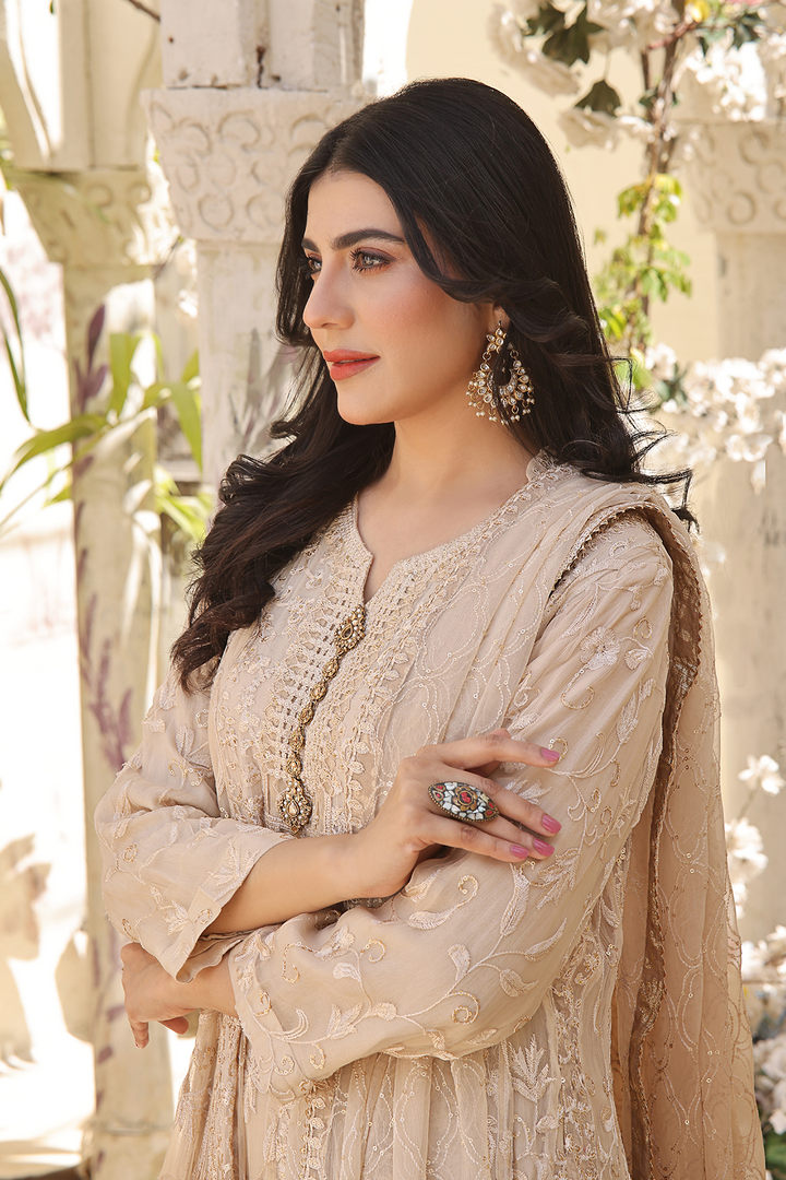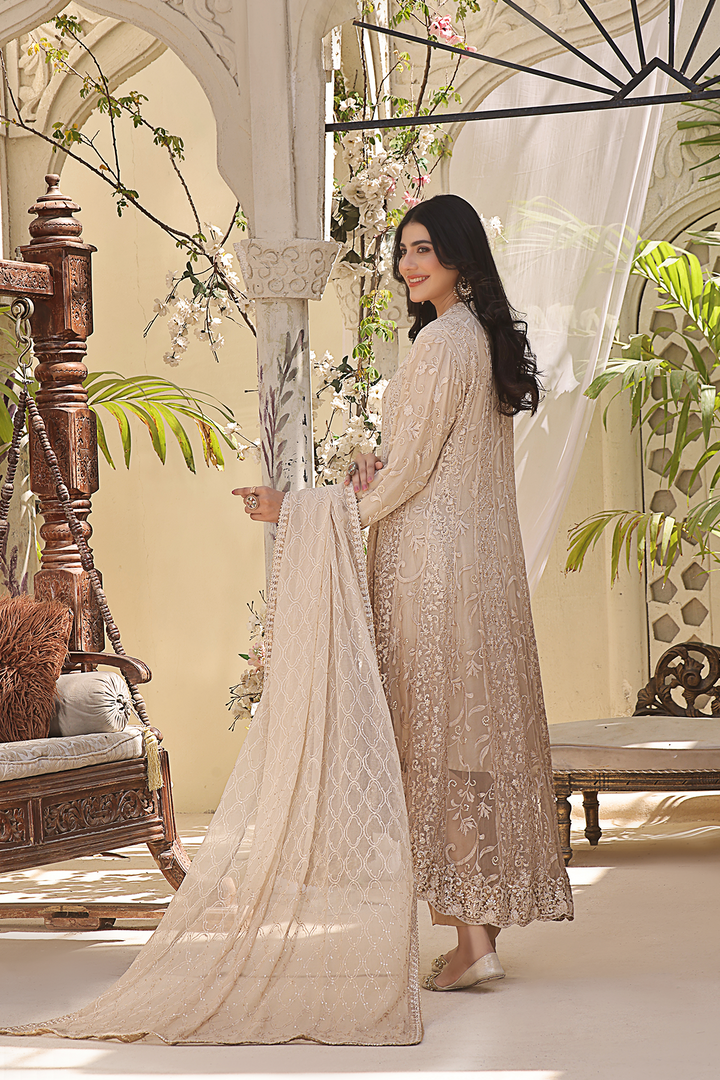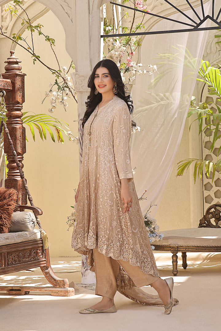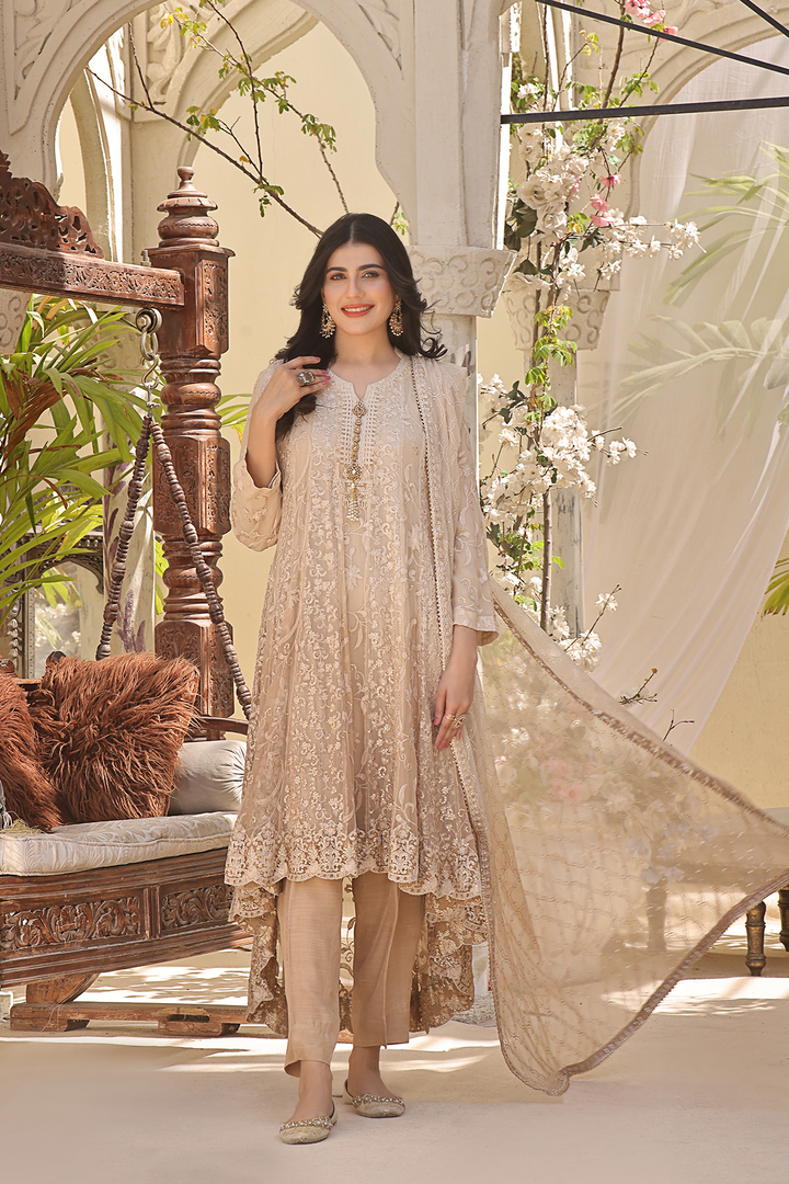 Make a stunning entrance with this exquisite ensemble featuring a pure chiffon shirt embellished with intricate embroidery, reminiscent of delicate lacework.