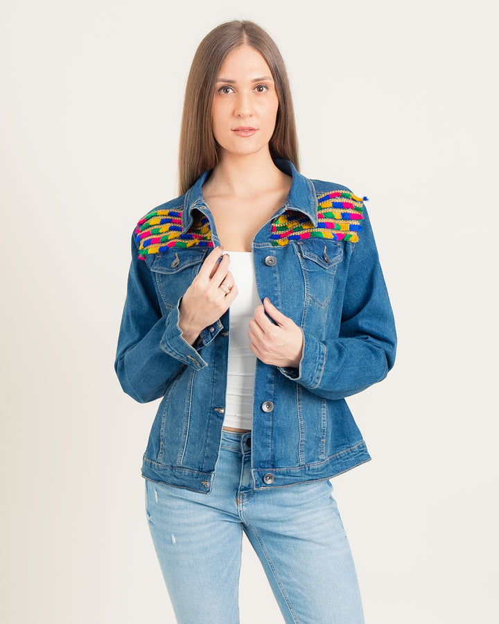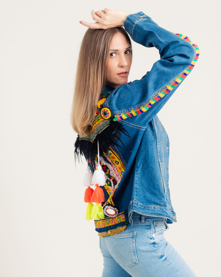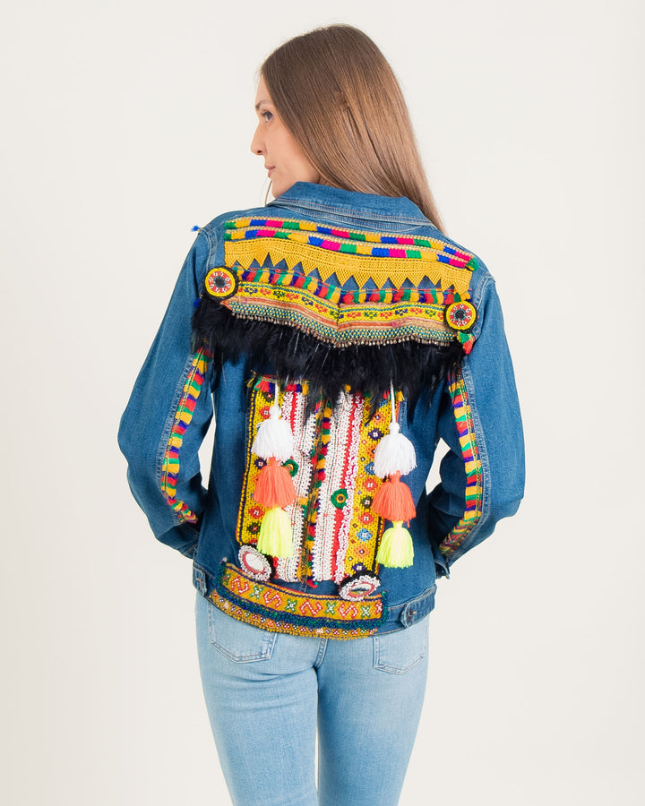 The startling Sashiko denim jacket's appealingly detailed and ornate patterns reflect the rich cultural heritage of the East, while its vivid colours and bold designs pay homage to the ethnic art of the West. The mix of cross-cultural designs in a luminous prism creates a stunning visual contrast.