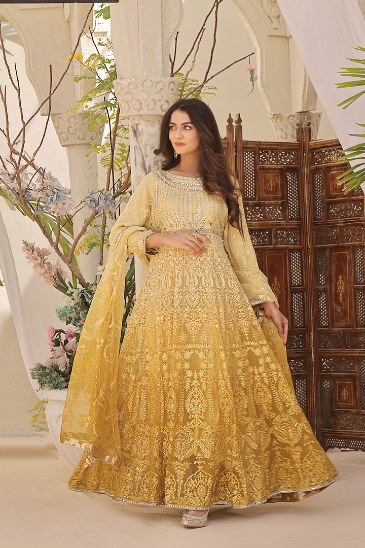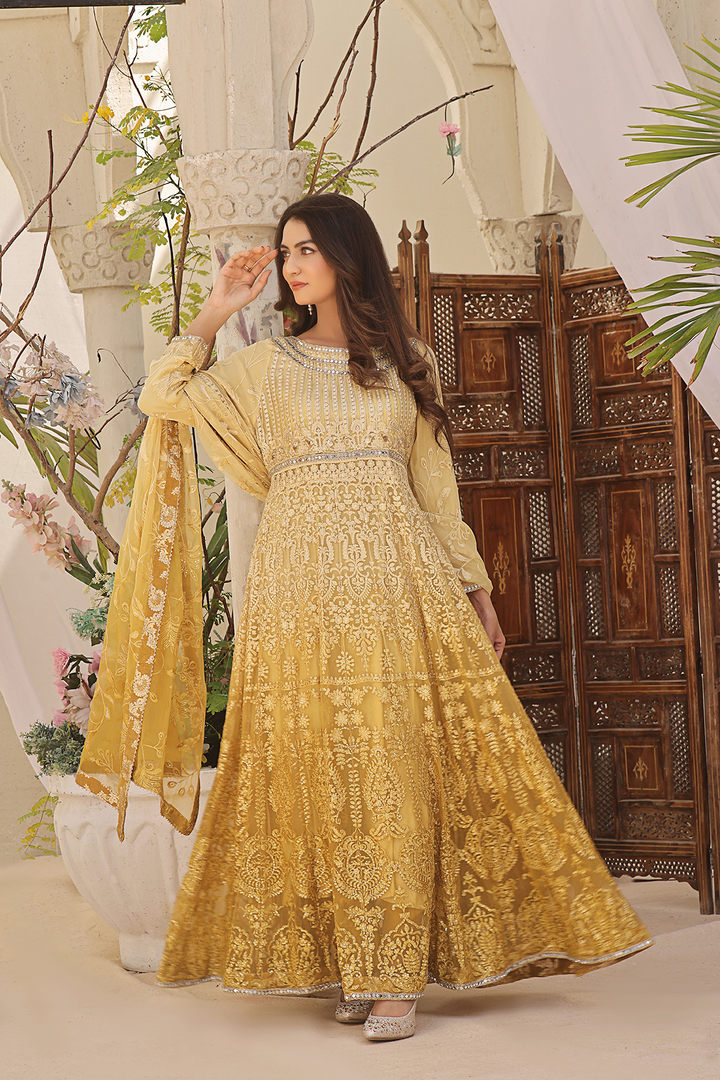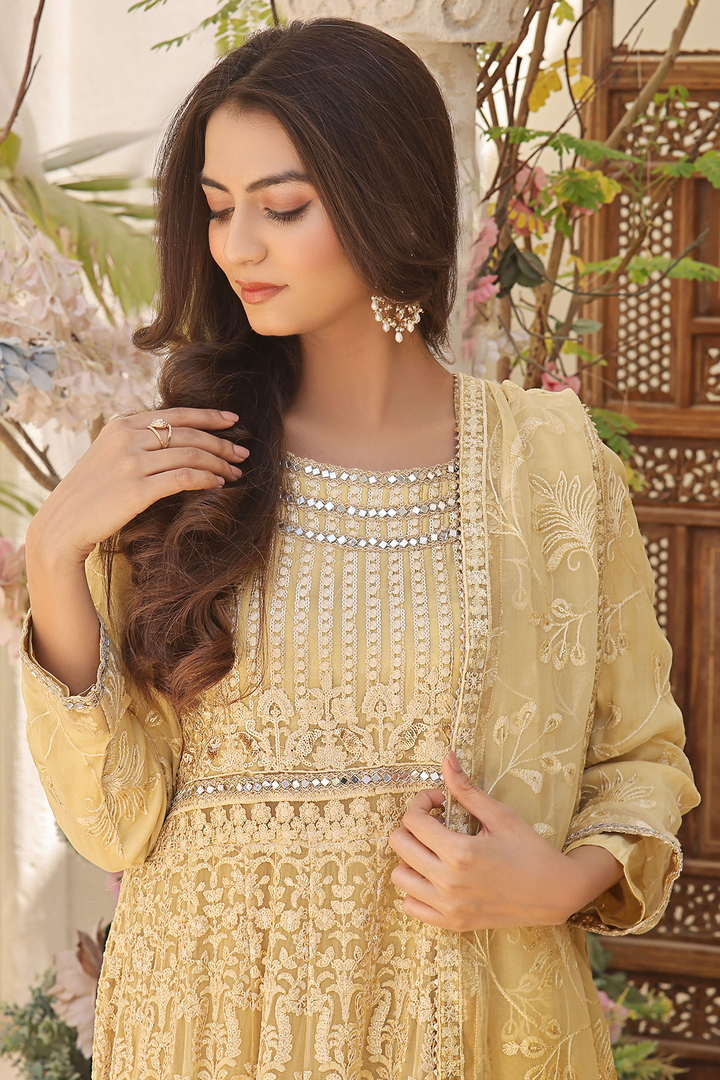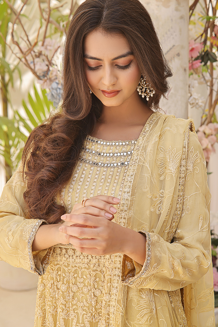 Illuminate any occasion with this radiant ensemble featuring a pure chiffon shirt embellished with intricate embroidery, reminiscent of sun-kissed blossoms.