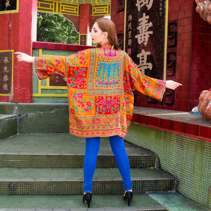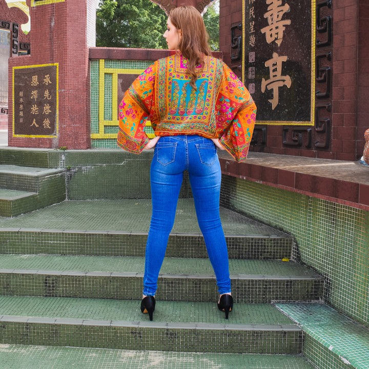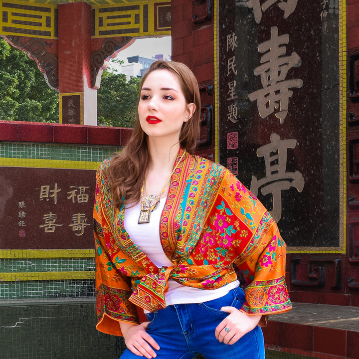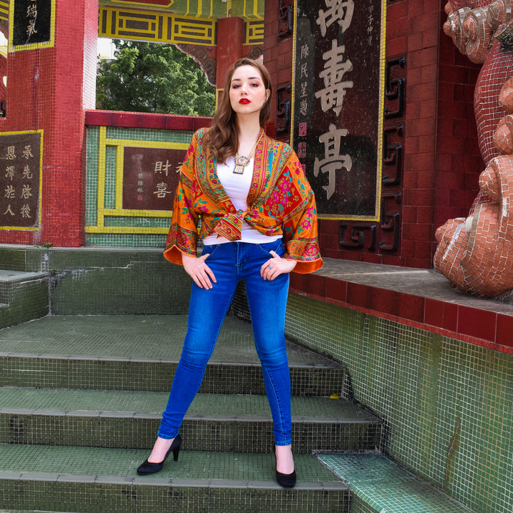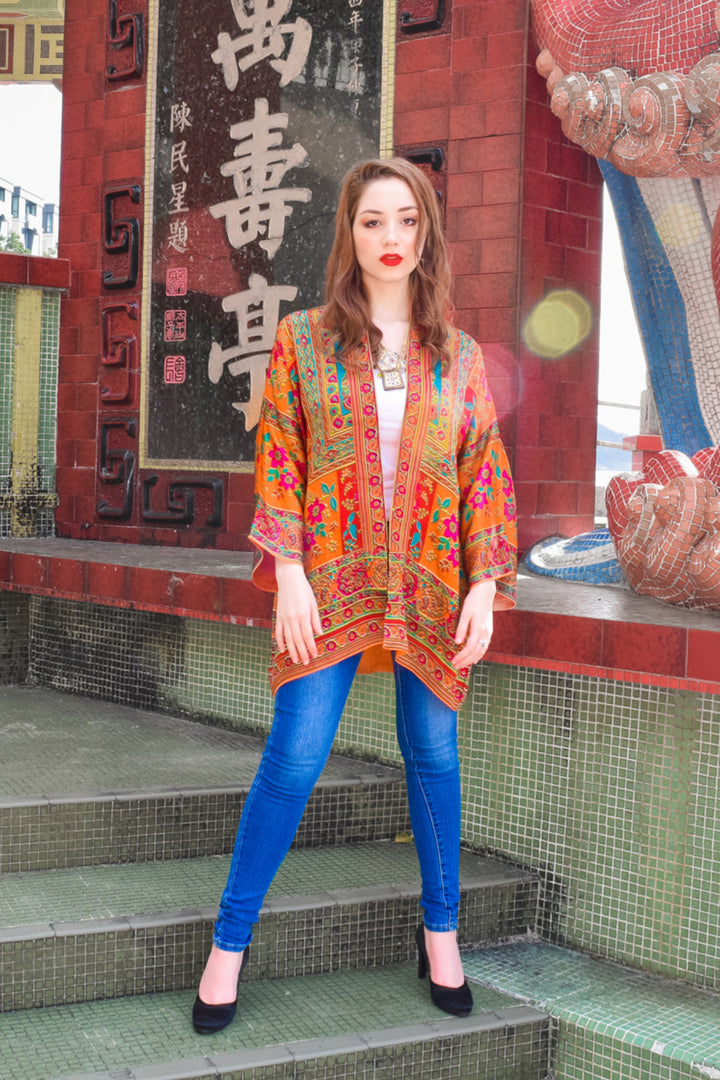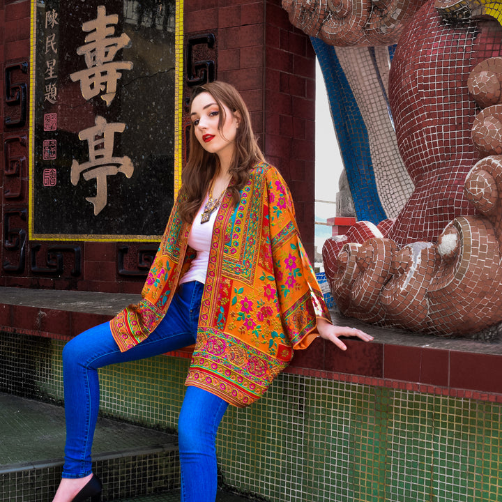 It's a tangy garden vibe with glimpses of greens and florals! This satiny silk Kimono with symmetrical patterns in fiery colors presents itself as an ideal addition to your wardrobe.