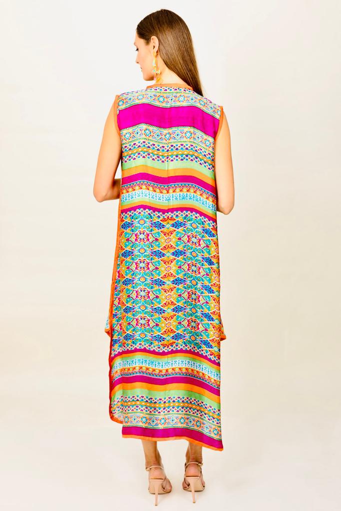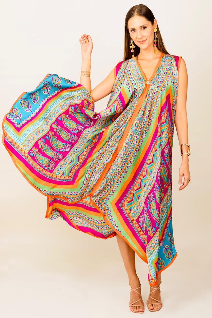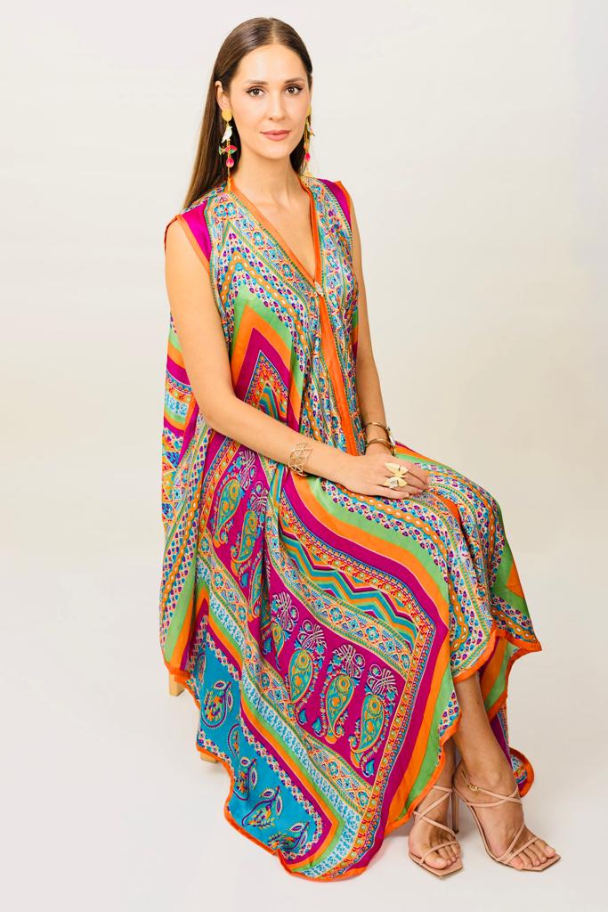 The Winola kaftan breathes life into tropical traditions adorned with funky fables. Folklore and fantasy meet a vibrant pop palette, a fusion that transposes the sands of time into a vivid contemporary canvas.