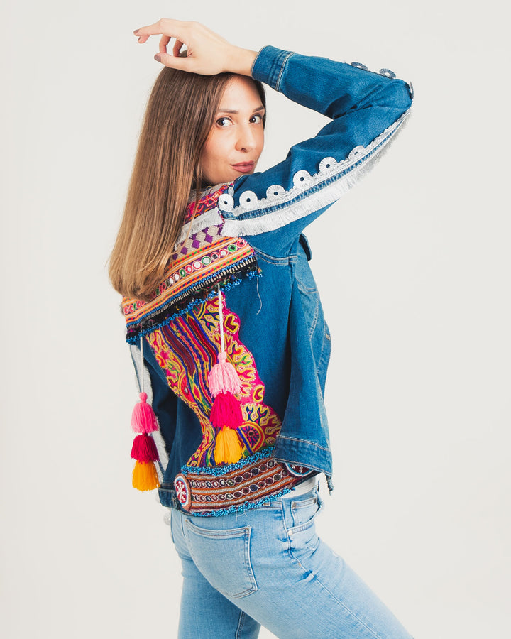 The intricate details and bold colours of the Zellige denim jacket seamlessly blend the polar cultural aesthetics, creating a captivating and harmonious synthesis of style. The popping colours evident in the details and tassels in combination with the white statement addition render this fusion denim jacket a top-notch fashion composition.