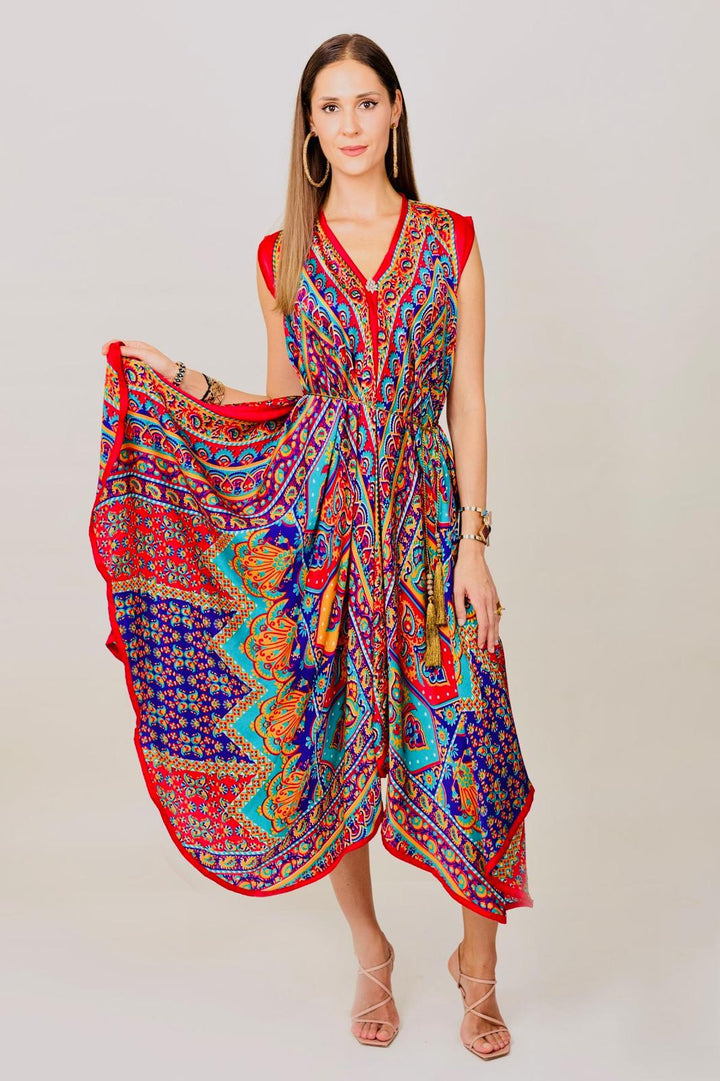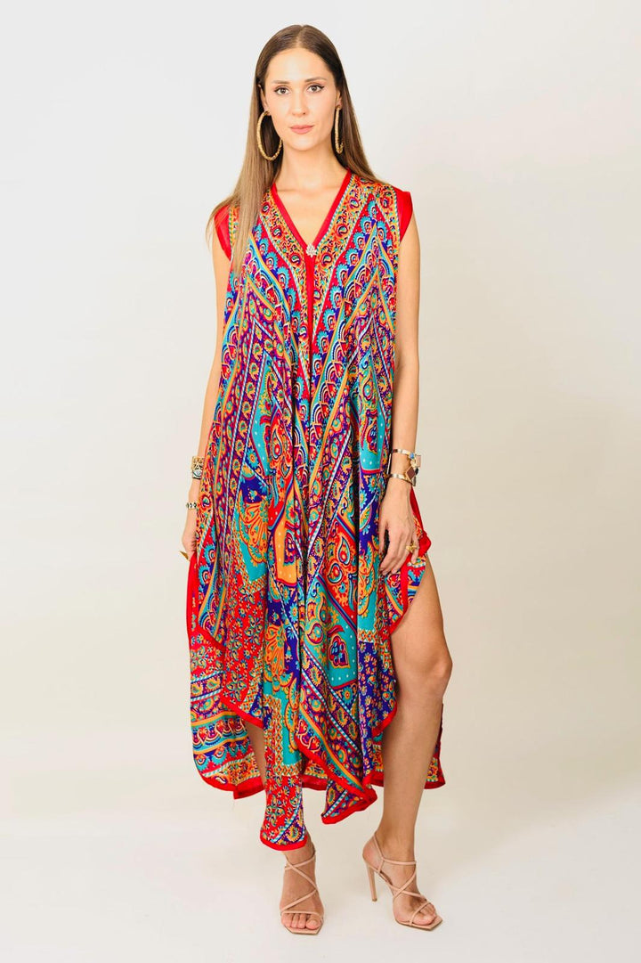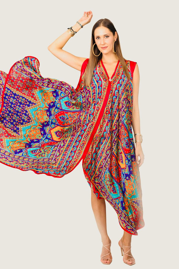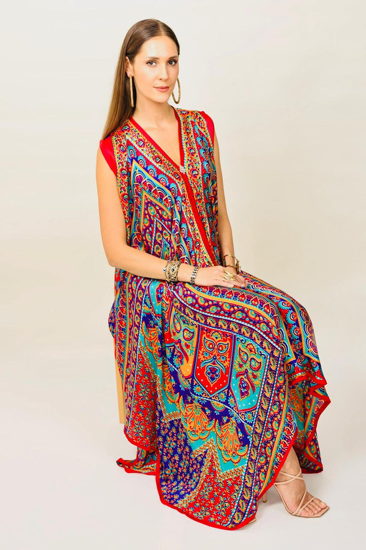 The Zemirah Kaftan composes a beachy sunset overture harmonized with funky fusion. Cultural tapestries meet pop hues, creating a sonic resonance that bridges fashion with modern vibrancy.