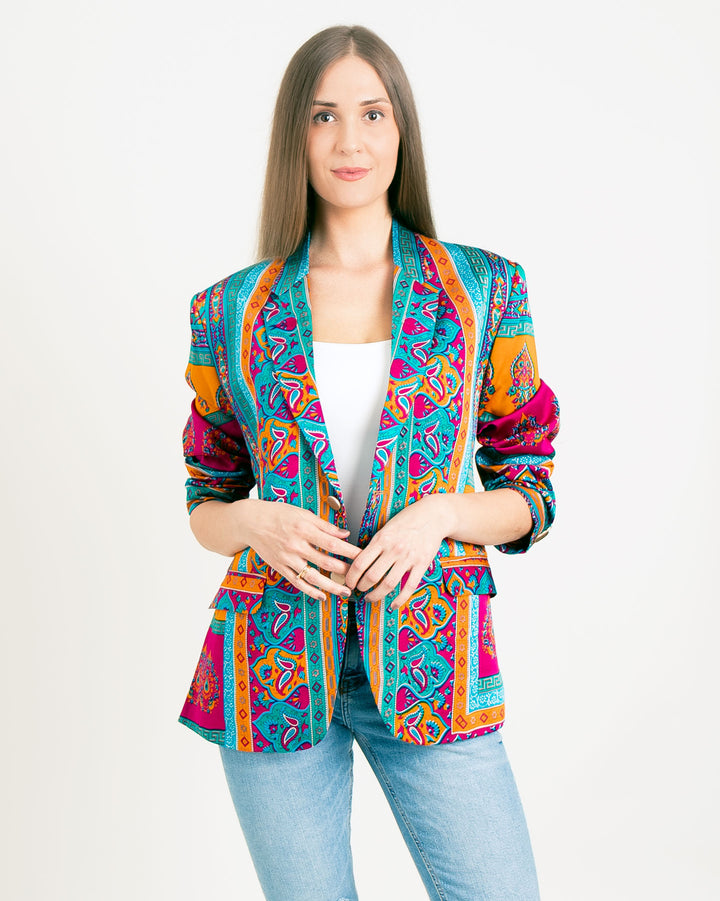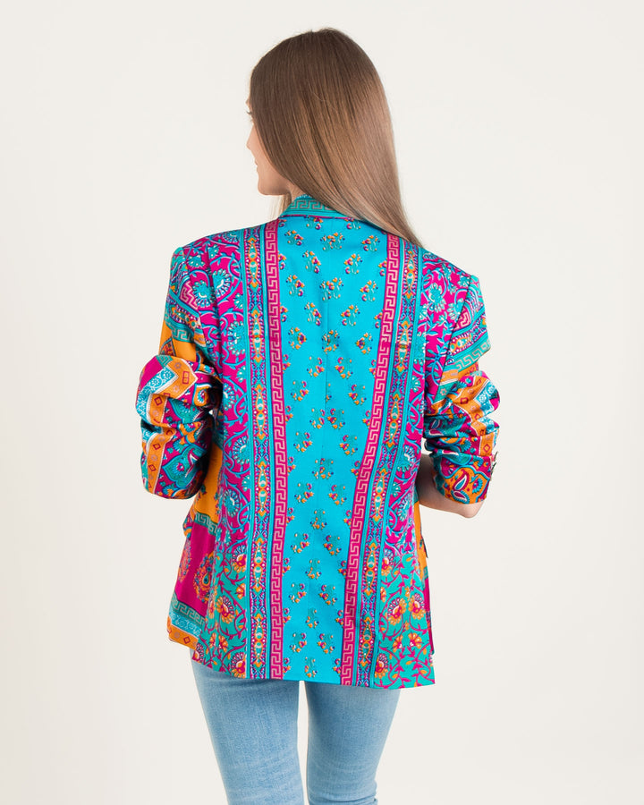 Add a touch of glamour to your wardrobe with this elegant fusion blazer in a classic primary colour palette. The ornate patterns and delicate designs add a touch of traditional charm, while the modern cut and slim-fit silhouette keep it contemporary and stylish.